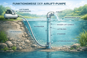 Bewegen Sie bis zu 20.000 Liter Wasser mit nur 50 Watt. Die komplette Materialliste und Schritt-für-Schritt Anleitung für Ihr Airlift-System (Luftheber).